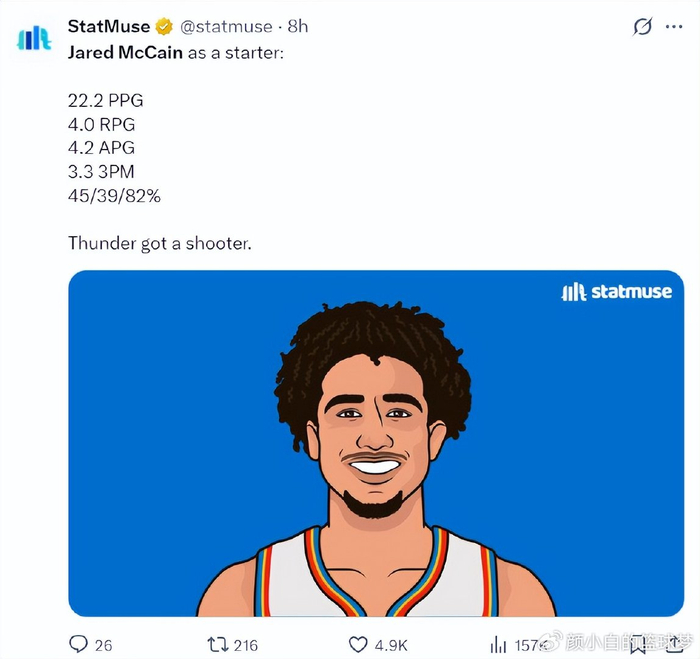 ESPN记者布莱恩-文霍斯特在播客节目中这样说道:联盟内部人士普遍认为,雷霆4换1得到麦凯恩是绝对划算的。他在节目中提到了4个要点,因为篇幅太长,我这里就精简一下他的观点: